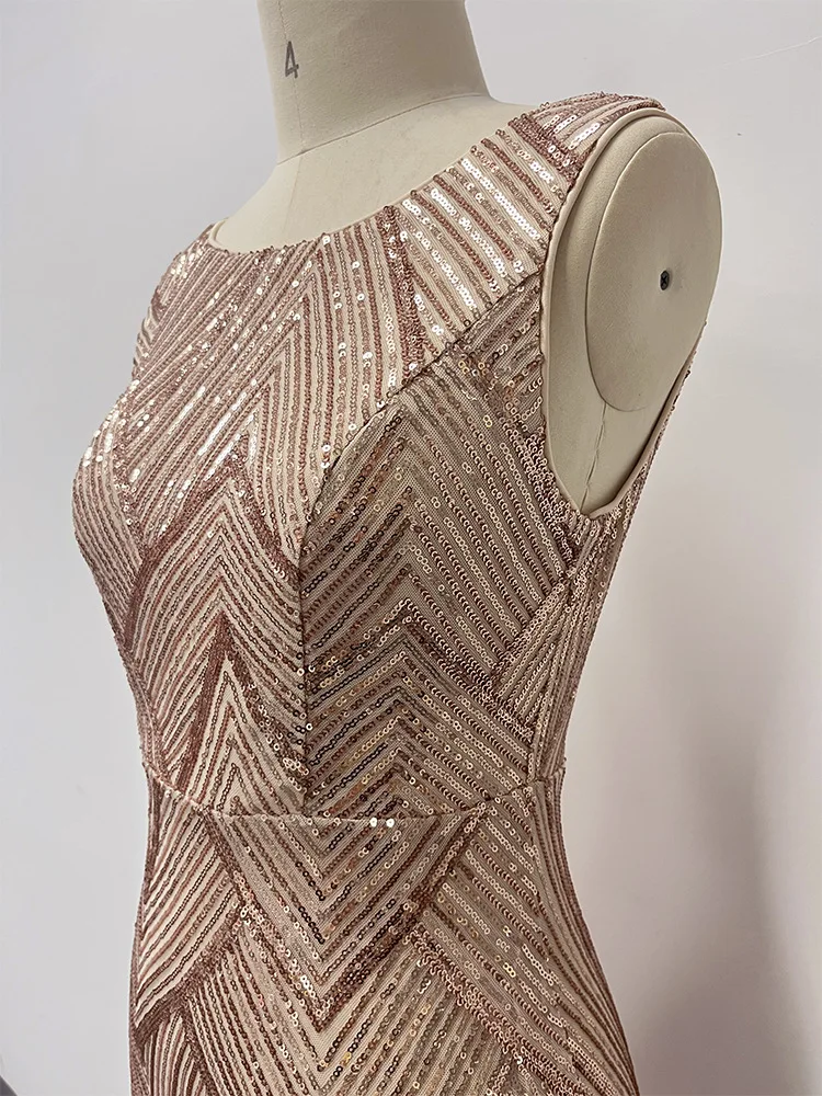 2025 Women's Sleeveless Round Neck Luxury Rose Gold Party Dress Mermaid Shining Long Size Evening Dress