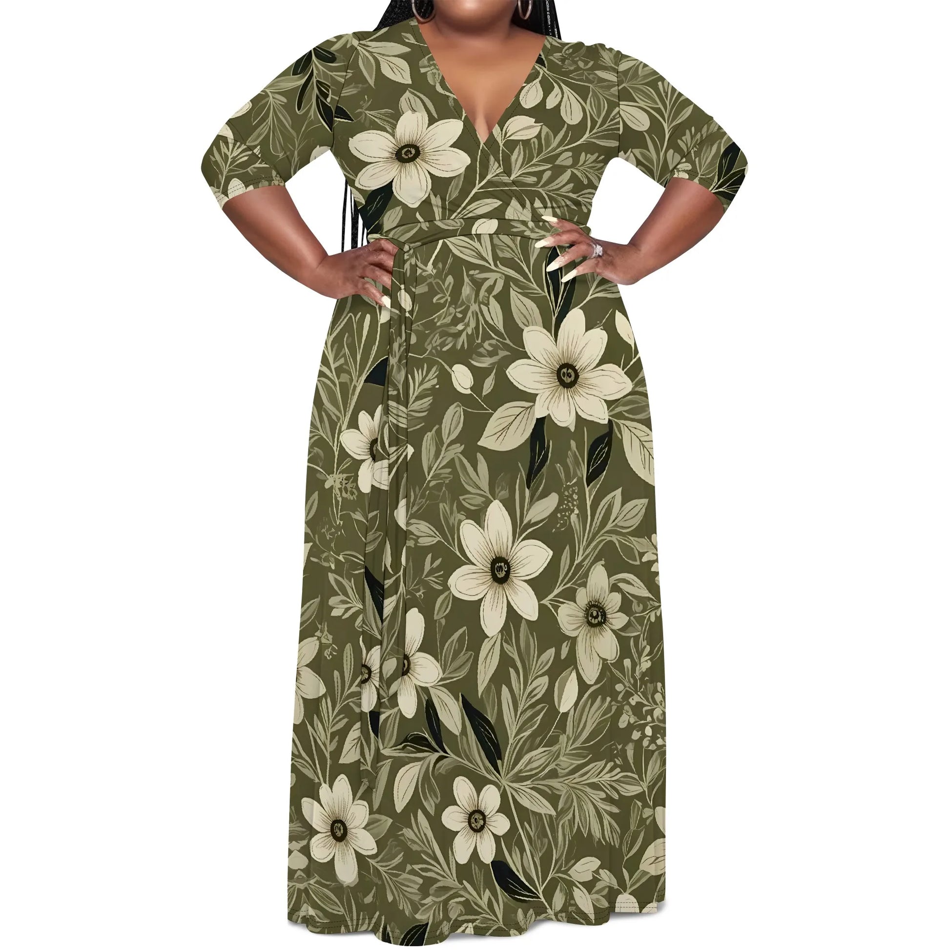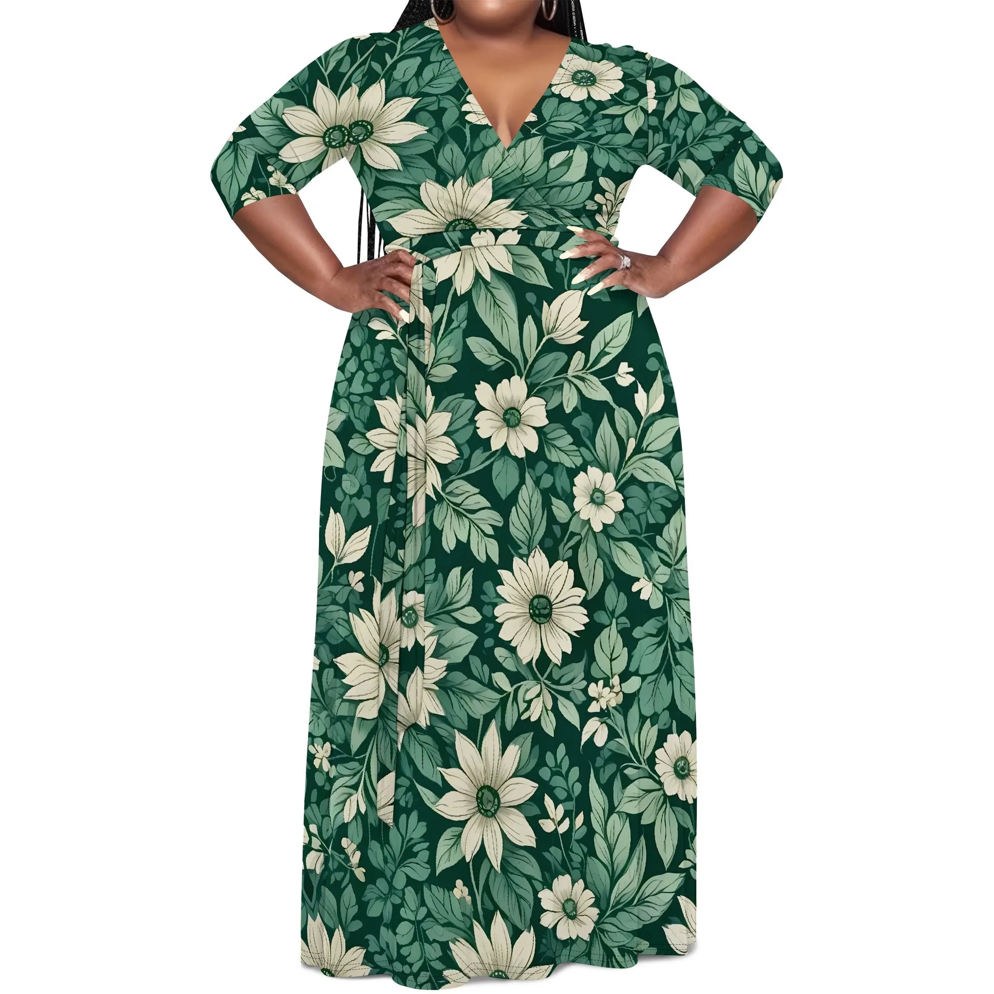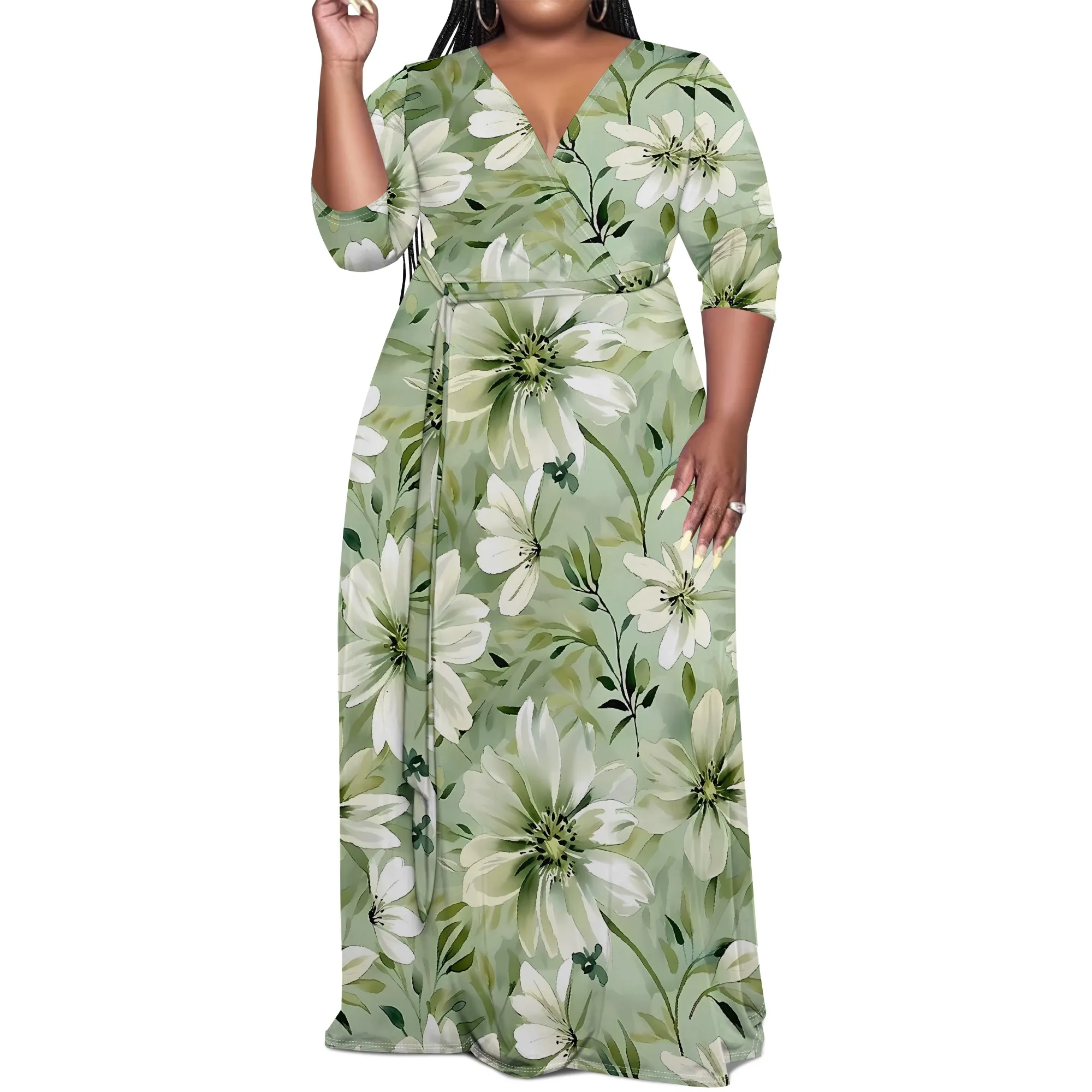 Plus Size Green Floral Maxi Dress V Neck Mid Sleeve Belted Casual Elegant Style